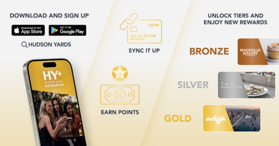 Download the app via Apple App Store or Google Play. Search 'Hudson Yards' to locate. Link credit card(s) to the app. Shop and dine and receive automatic points towards your rewards. No need to show app at time of purchase.